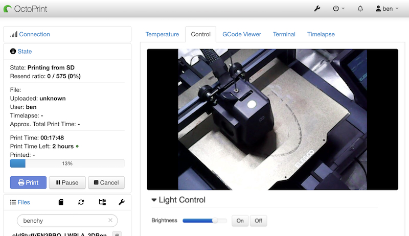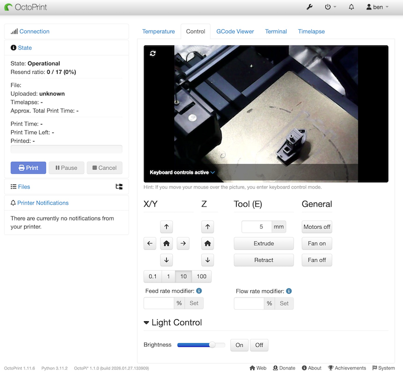 In order to shed light on my 3D prints, I added a custom control to OctoPrint running on a Raspberry Pi so that I can turn on the LED lights and control brightness through the web page. This is was easy to do through the config.yaml file.