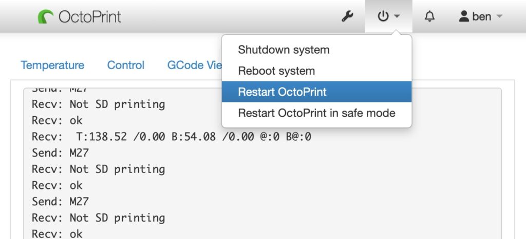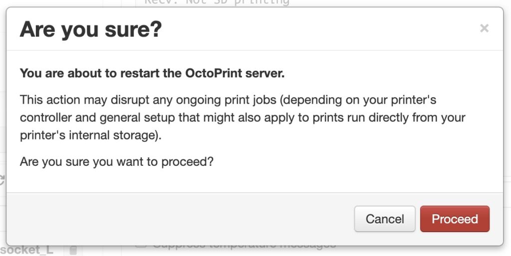 After editing and saving config.yaml you will need to restart OctoPrint for the changes to take effect. Click on the System menu icon at the top menu bar and select Restart OctoPrint. When prompted with “Are you sure?”, click Proceed. After that it will notify you that “Server is Offline”. If everything goes well then there is no need to do anything here but wait. Once the server restarts, the banner will disappear. If prompted, refresh the webpage.