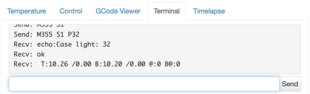 Manual tests in the OctoPrint terminal work great. The following command turned on the lights to 32/255 (about 12% brightness).